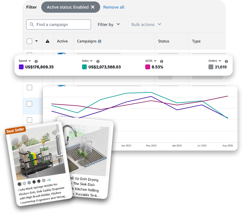 Our PPC management focuses on building long-term, sustainable performance. You can expect clearer keyword structure, smarter bidding, reduced wasted ad spend, improved ranking on important search terms, and more consistent sales growth. Results depend on your product quality, reviews, price competitiveness, and listing optimization, but our approach ensures campaigns move toward greater profitability and scale over time. We combine manual strategy with advanced tools to optimize your account continuously-not just once a month.